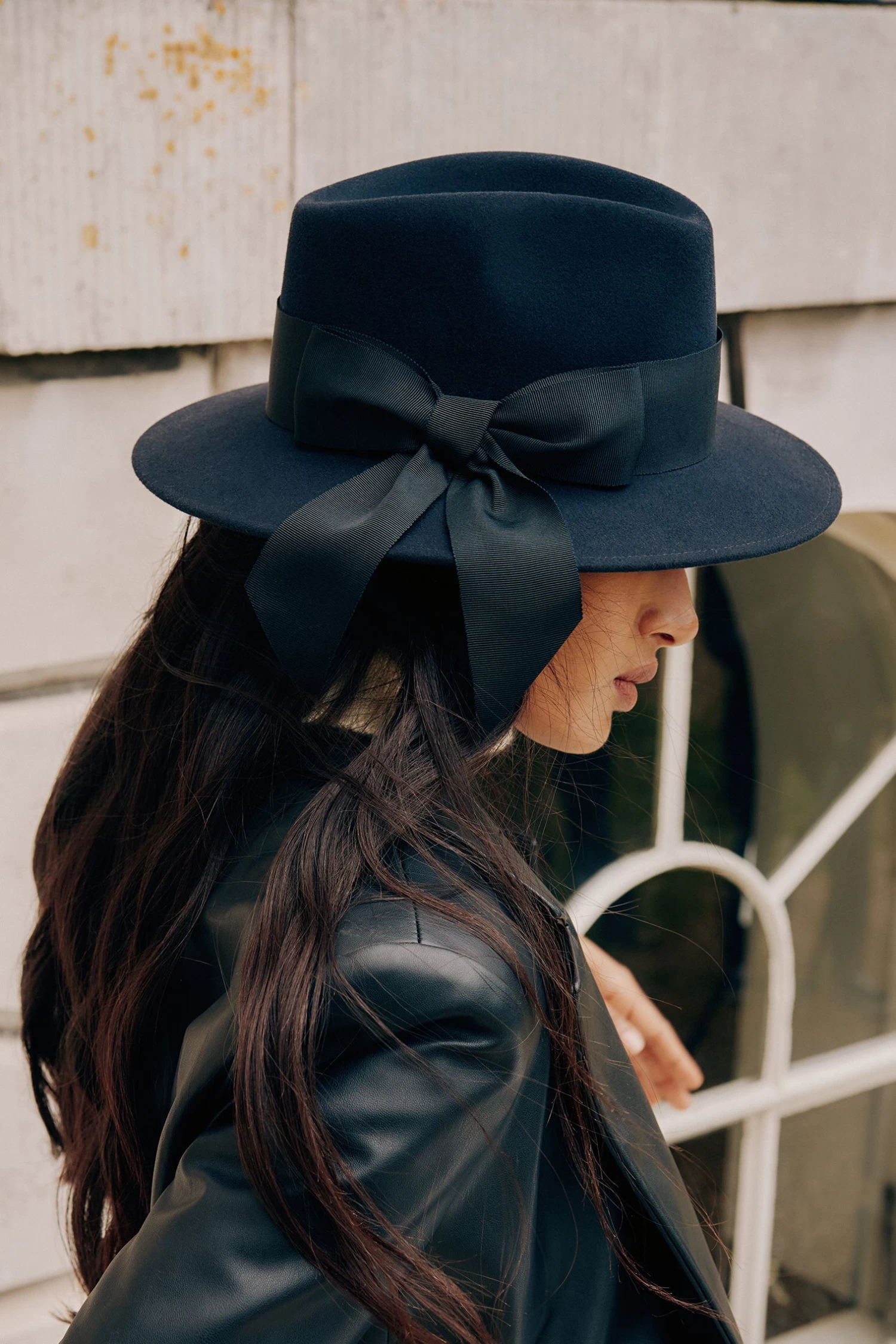 An oversized Petersham band & bow combine to bring an understated poise to this distinctive trilby silhouette.