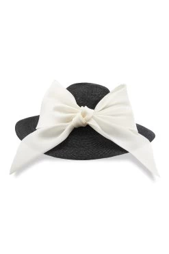 A wearable monochrome palette that goes with so many ensembles. The Assam is an ivory white sinamay saucer hat with white silk camellia detailing and spiralling black sinamay bows complemented by black and white polka dot ostrich quills. This hat is perfect for Royal Ascot and also makes for a great wedding guest hat.