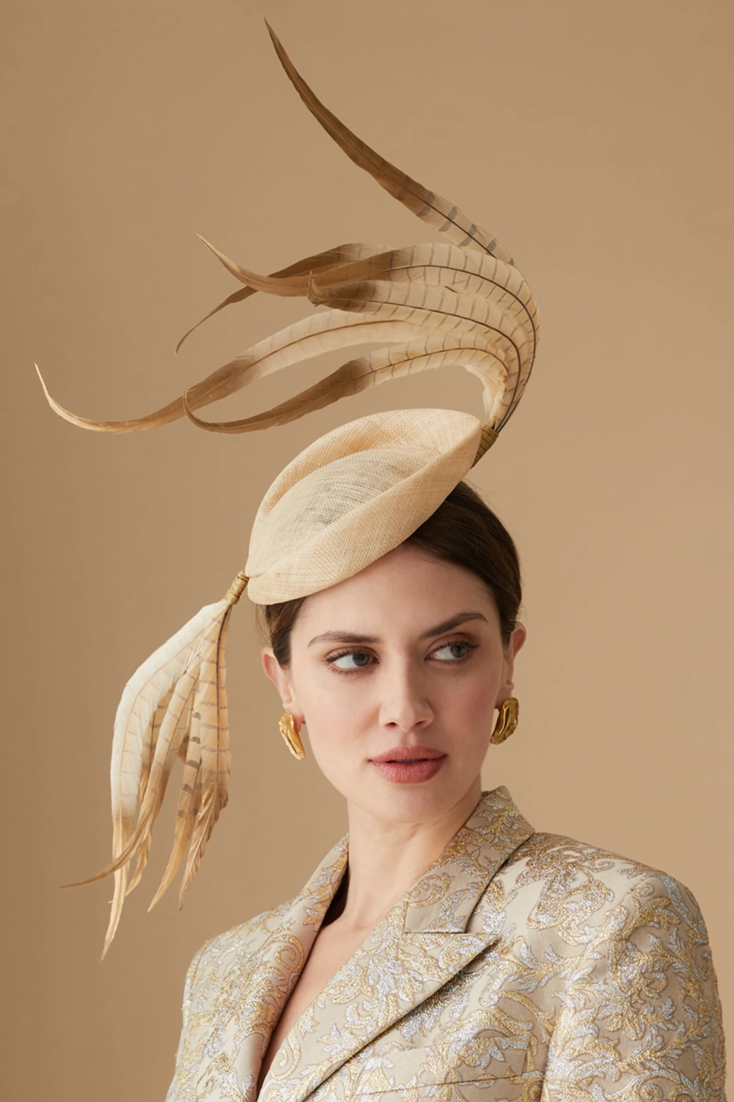 Introducing our exquisite Lapsang Percher Hat, a must-have for those seeking the epitome of elegance and sophistication. Crafted with meticulous attention to detail, this hat features hand-sculpted gold ombré bleached pheasant feathers, adding a touch of opulence and refinement to any ensemble. Designed to capture attention, the dramatic sweeping pheasant feathers create a show-stopping look that is perfect for the prestigious Royal Ascot Races. Elevate your style and make a statement with this stunning accessory that effortlessly combines tradition with contemporary flair.