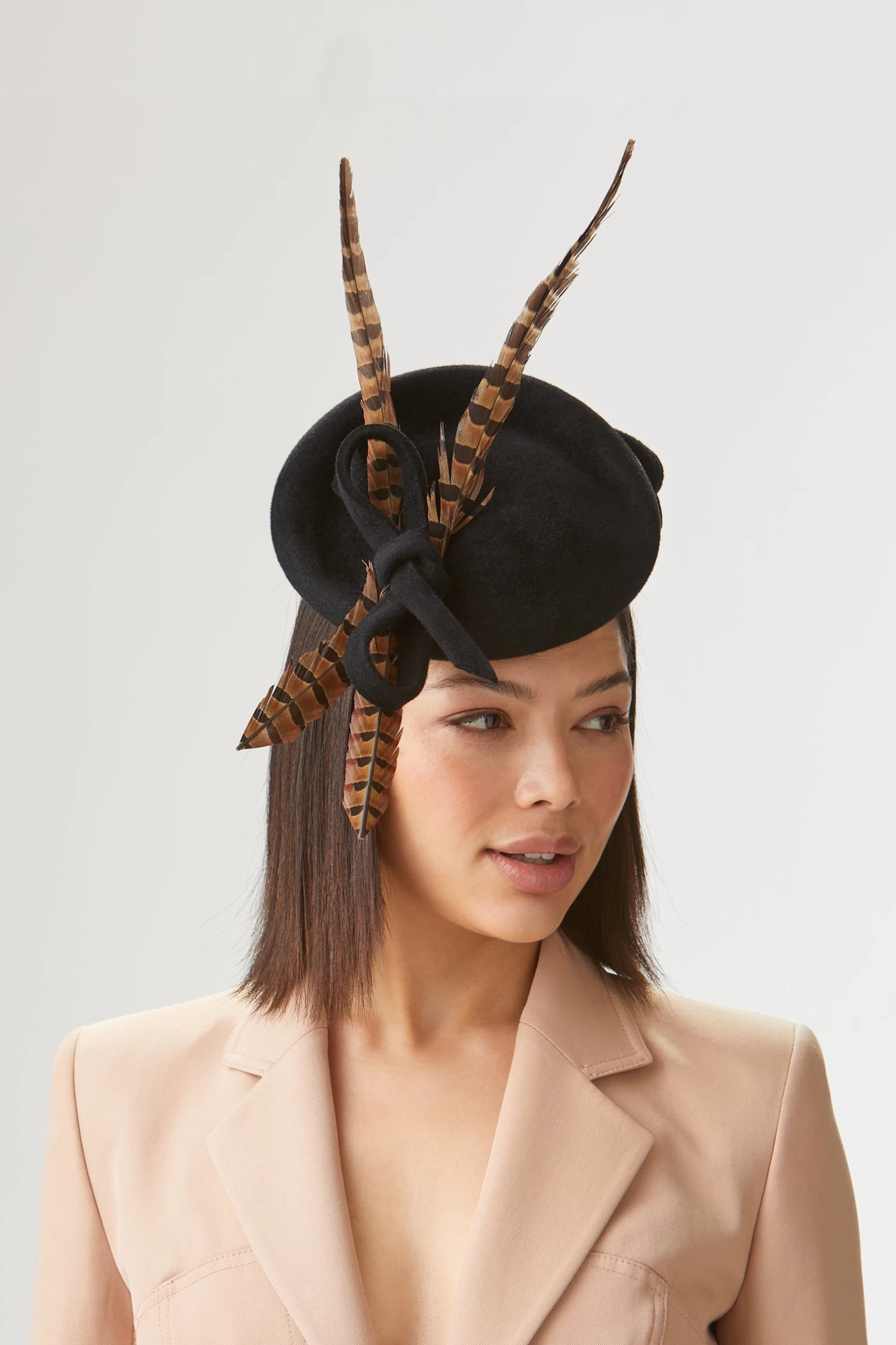 The Loretta black percher features a sculptural bow at the front and back of the hat, and two graceful pheasant tail feathers. It’s made from plush velour felt. This piece is also available in red and white.Â