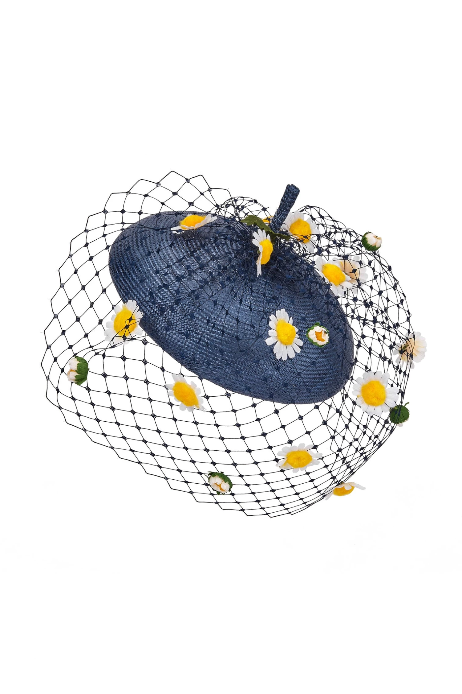 Available in ivory, blue, and black and finished with a vintage daisy-speckled veil, elastic at the nape, and a comb anchor, this is a statement piece.