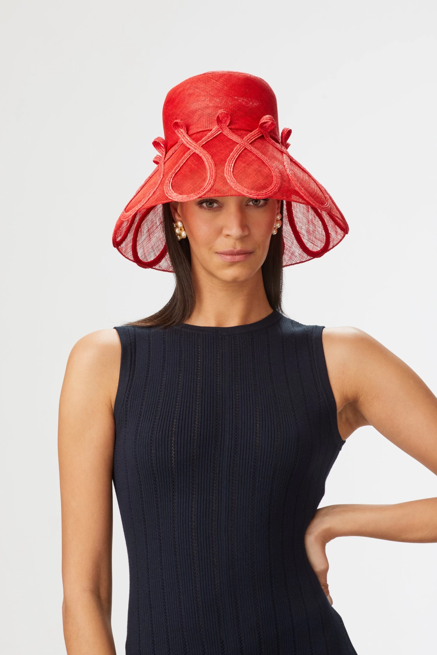 “The Vita Cloche is a little slice of vintage style heaven. The lipstick red sinamay cloche is adorned with a swirling pedal straw trimming, giving a playful modern edge to this traditional shape. The Vita looks equally great with a monochrome suit or with a full skirt dress.” Awon Golding.